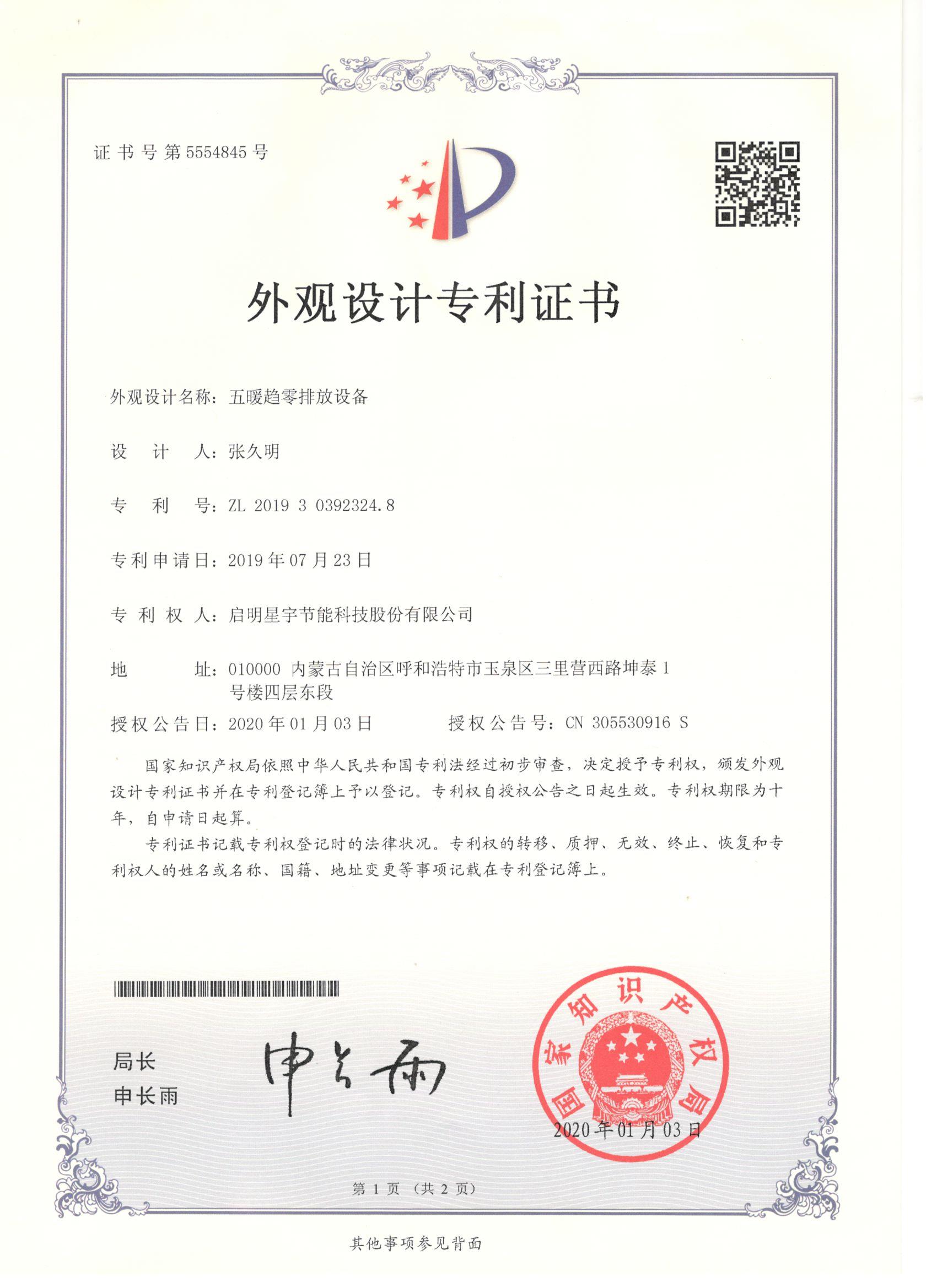 五暖趨零排放設備外觀設計專利證書